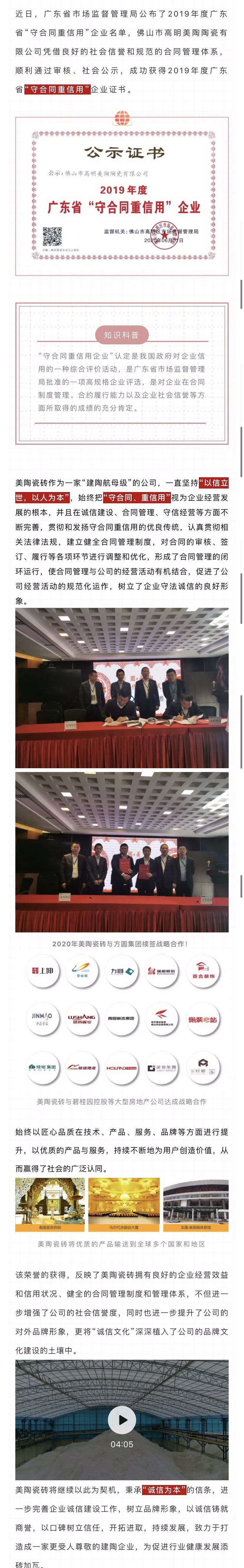 喜訊丨美陶榮獲2019年度廣東省“守合同重信用”企業(yè)證書