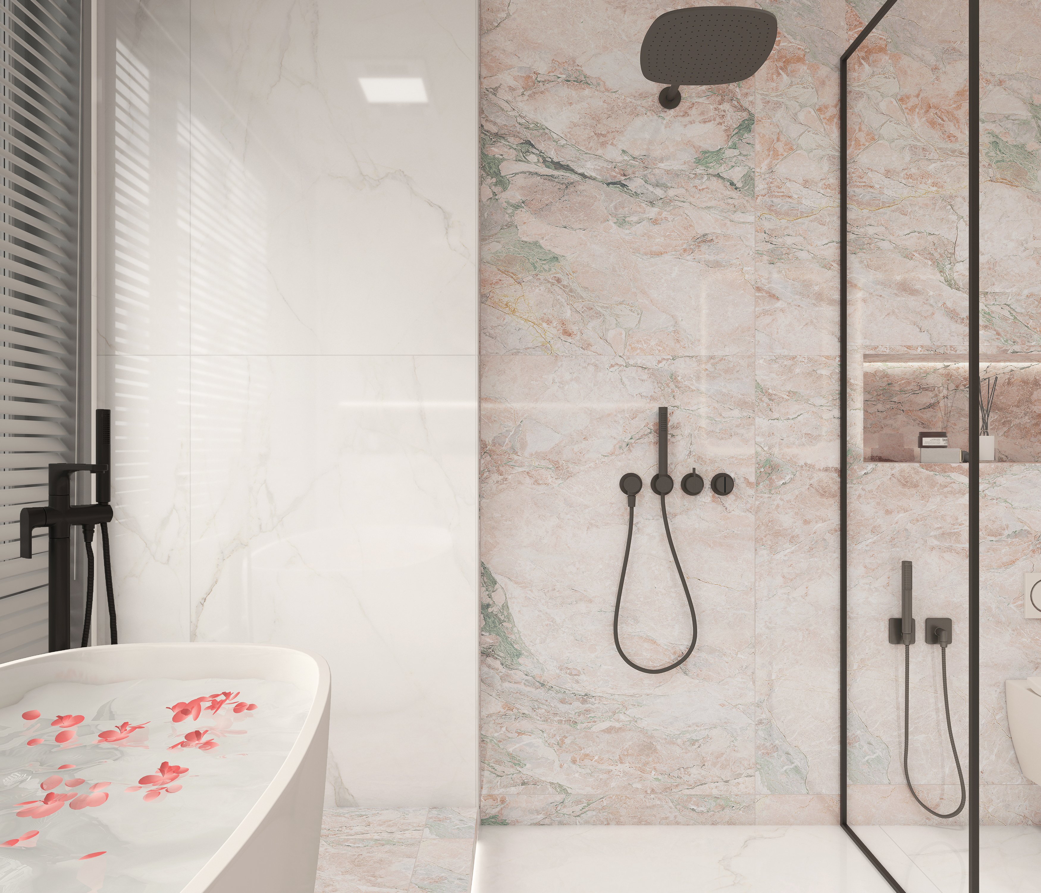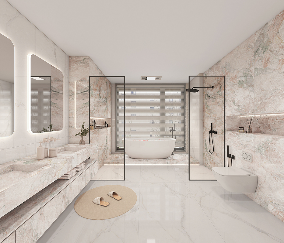 靈感源自四季粉奢石 以時光釉+AI復刻技術,1:1復刻天然奢石肌理 精雕工藝讓紋理自然下陷,指尖可觸真石起伏 整體粉調(diào)為主,綠、金紋理相間其中 如晨曦映上花瓣般輕柔漫開,夢幻多變 自帶仙氣,賦予空間浪漫綺麗的輕奢感