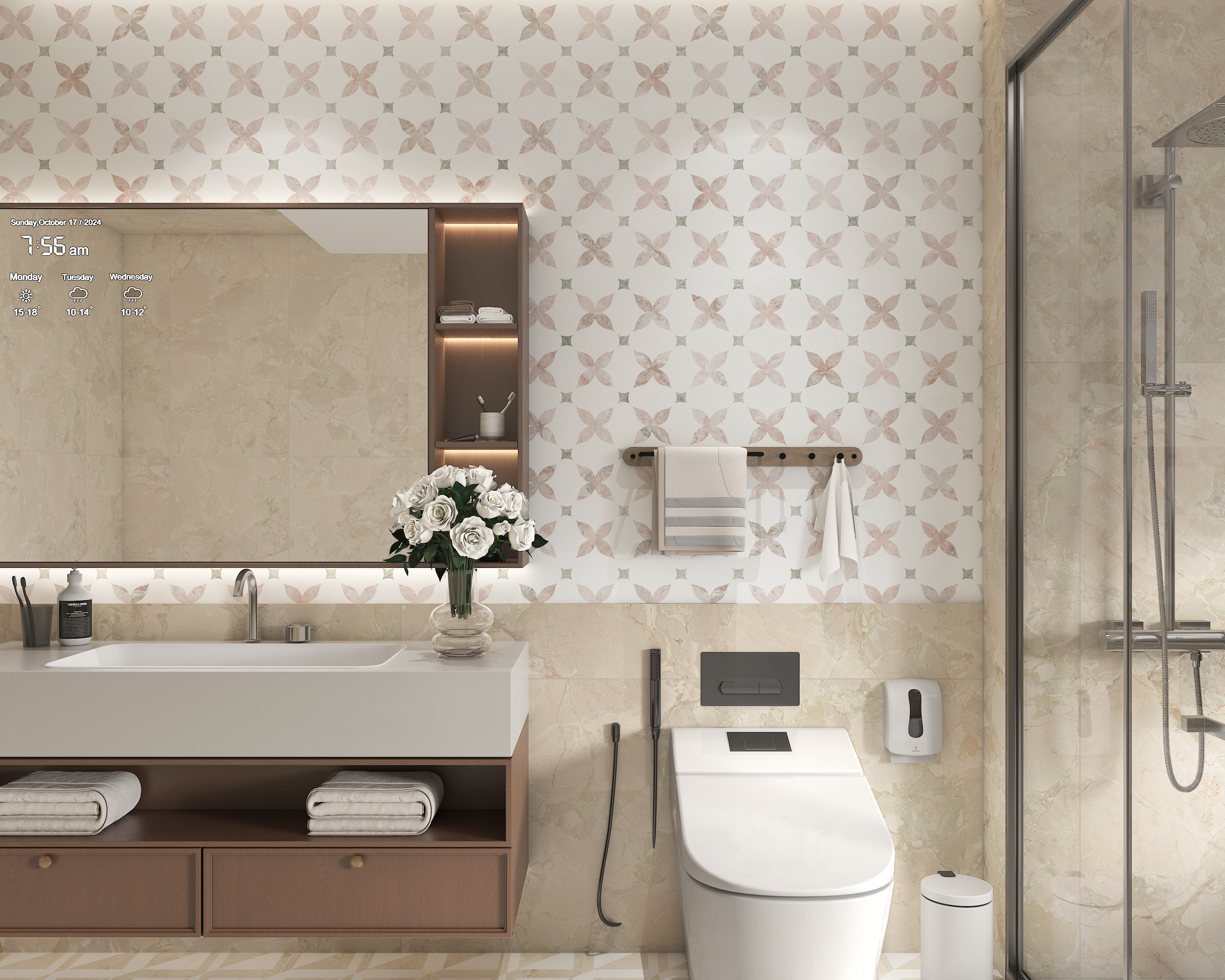拼花設計,為地面、墻面增添獨特韻律,豐富空間層次 賦予空間愛麗絲漫游仙境般的夢幻感,讓空間成為浪漫與自然共生的詩意場域 每一寸空間,都訴說著對美學與自然的浪漫遐想