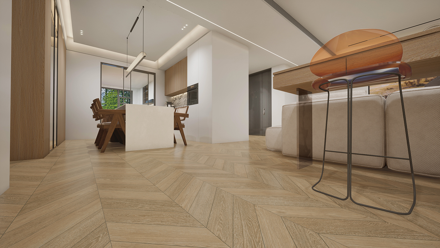 魚骨拼接的木紋被解構成現(xiàn)代線條 銳角與延展的紋理形成視覺韻律 賦予空間復古而利落的層次感